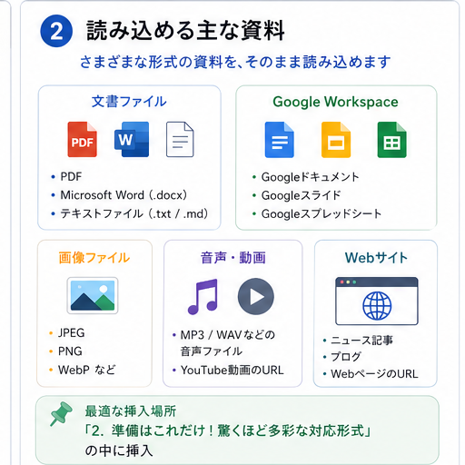 「AIに資料を読み込ませる」と言っても、特別な準備は不要です。あなたが普段使っている様々なファイルを、そのまま読み込ませることができます