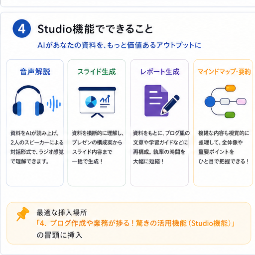 NotebookLMには、単なる「質問への回答」を超えた、思わず「すごい!」と声が出てしまうようなStudio(スタジオ)機能が搭載されています
