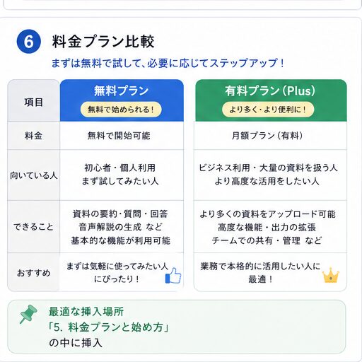 • 無料プラン: 基本的な機能(ソースの要約、音声解説の生成など)が利用可能です